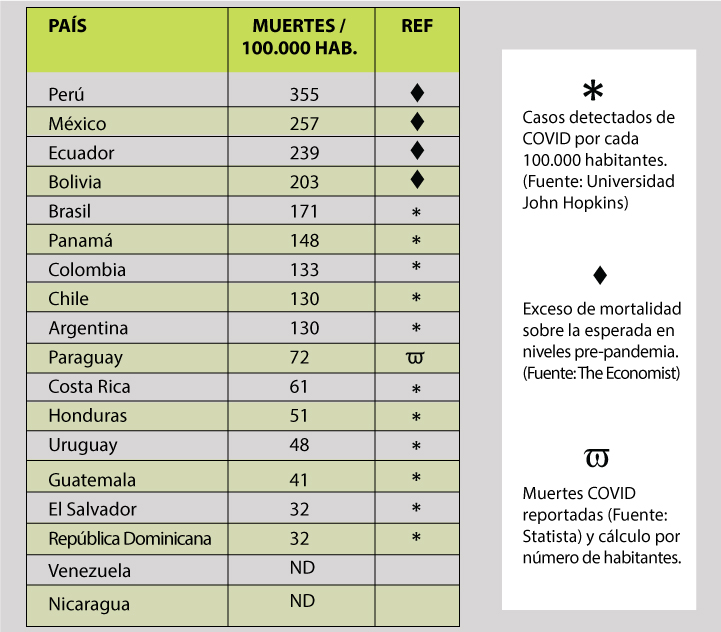 En el siguiente análisis se presentan para los países de la región, los indicadores de mortalidad por cada 100.000 habitantes, que se han publicado, sea a través de un registro de fallecimientos detectados por COVID-19, como por un cálculo del exceso de mortalidad general, que como lo hemos dicho es un indicador que podría ser más completo. Los datos se ordenan de mayor a menor: