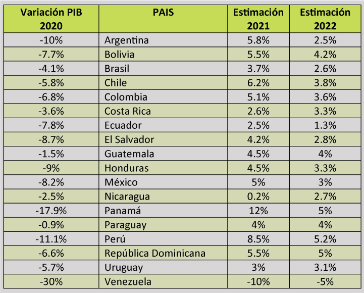 En el siguiente resumen, en orden alfabético se muestran los datos de la variación porcentual del Producto Interno Bruto – PIB, de los países de la región, en base a las últimas informaciones y proyecciones divulgadas principalmente por el Fondo Monetario Internacional. Se incluyen las proyecciones para este año 2021 y el siguiente, años que serían los de recuperación.