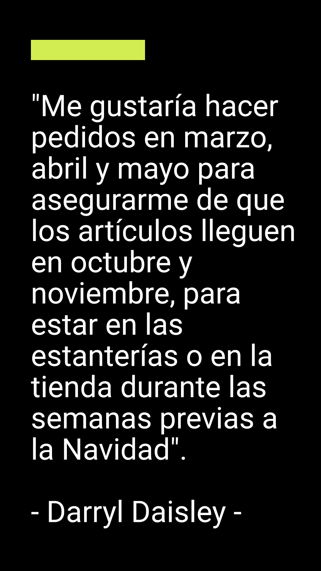 «Me gustaría hacer pedidos en marzo, abril y mayo para asegurarme de que los artículos lleguen en octubre y noviembre, para estar en las estanterías o en la tienda durante las semanas previas a la Navidad».