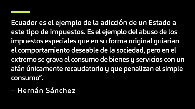 El impuesto al alcohol y a las bebidas alcohólicas incluyendo la cerveza es sumamente alto en Ecuador, con tarifas que van de USD 7.15 a USD 13.08 por cada litro de alcohol puro incluido en las bebidas, donde la mayor tarifa aplica a las cervezas industriales. Solo la cerveza artesanal (no industrial) cuenta con un impuesto reducido de USD 1.49 por cada litro de alcohol puro.